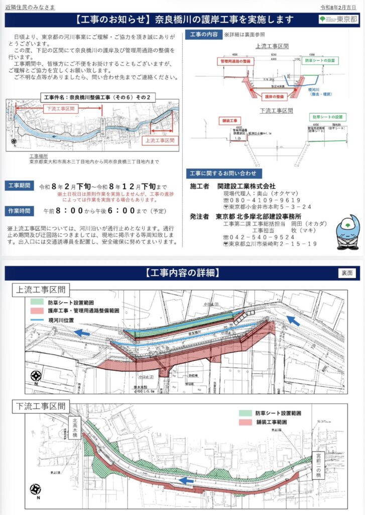 Feb 28, 2026 奈良橋川の護岸工事(一部区間)が始まりました 令和8年中の完了予定です 工事の関係で通行止め・迂回などがありますのでご注意下さい また、危険な事など工事に関係する事は問合せまでお願いします Posted in 地元活動, 活動報告 | No Comments » 関連記事 東大和市駅の高架下とBIGBOX周辺を会場とした「高架下の夜市」が開催 東大和市駅前の冠水 多摩都市モノレールの延伸! 本日は東村山駅東口にて 本日は八坂駅からスタート < 先月末、国土交通省より多摩都市モノレール延伸事業の許可を取得!